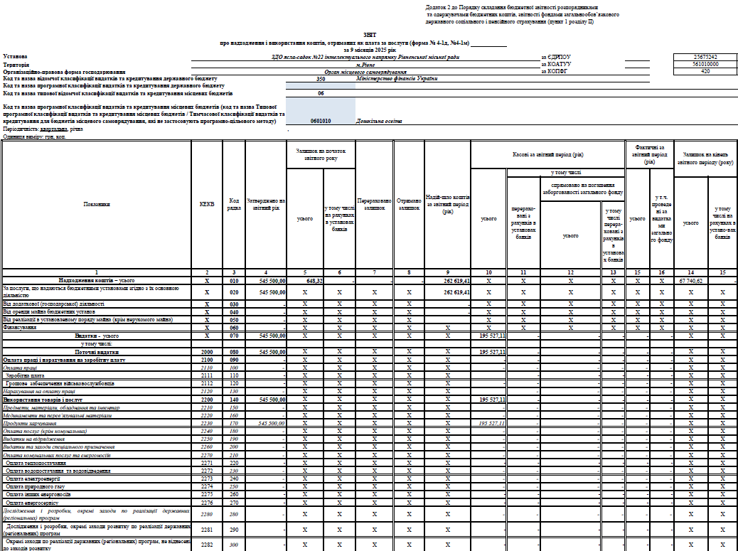 Звіт про надходження і використання коштів, отриманих як плата за послуги (форма № 4-1д, №4-1м) 2025 рік (9 міс.) назад до 2025 рік